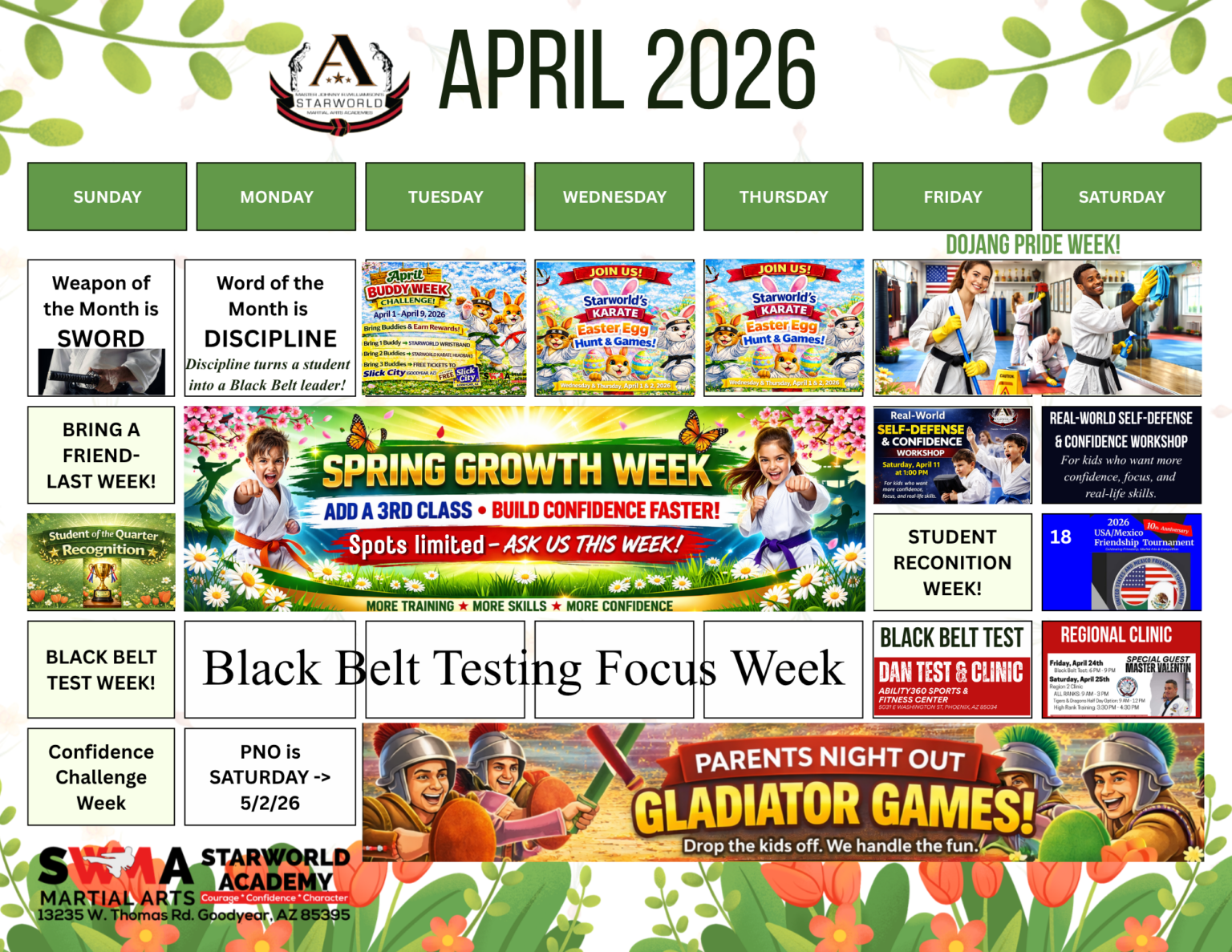 April is about discipline. Not forced discipline—but chosen discipline. At Starworld Martial Arts Academy, discipline is built through daily habits, focused effort, and the decision to do what needs to be done—even when it’s not convenient. After the excitement of testing and events, April reminds students that real growth comes from structure, control, and consistent action.
