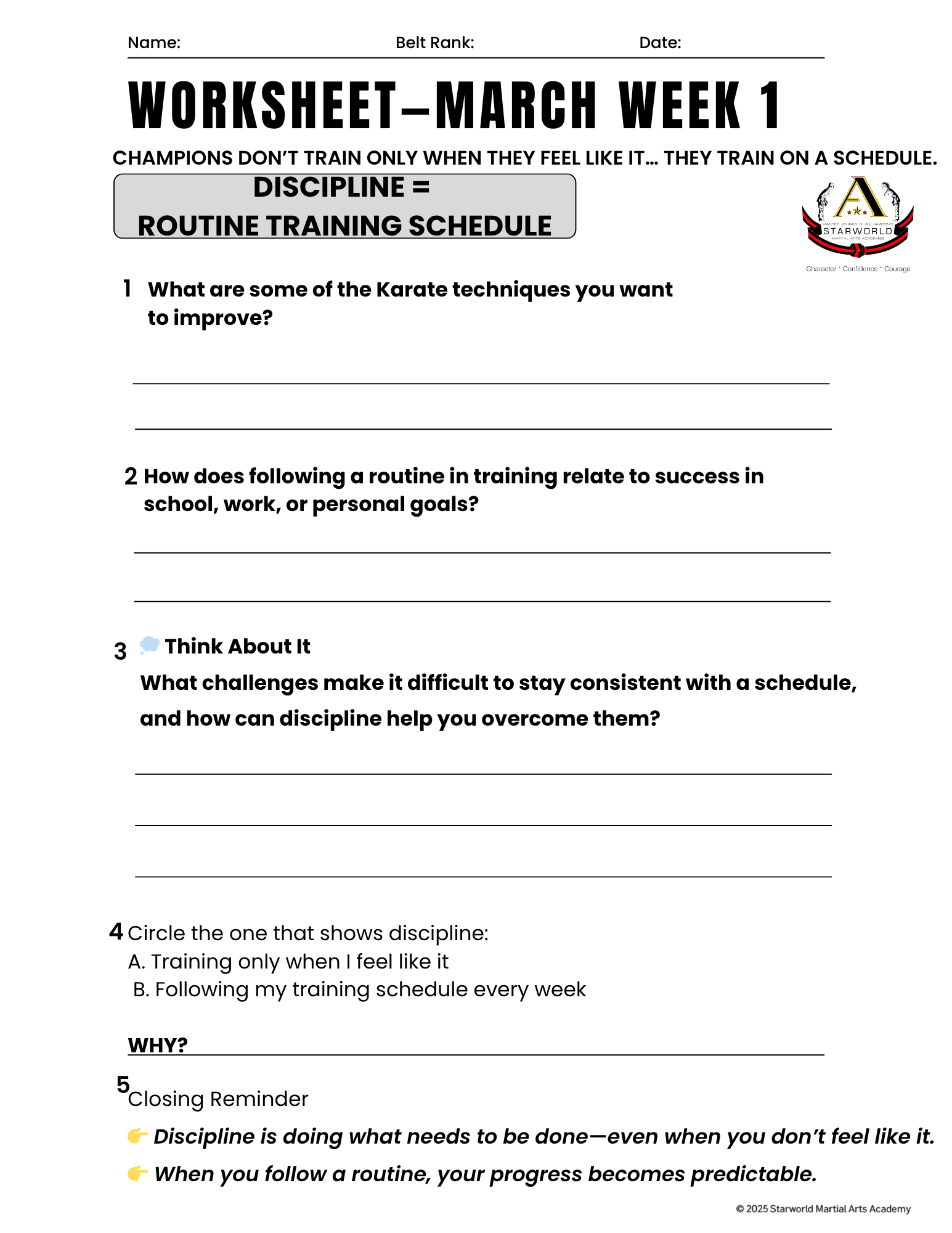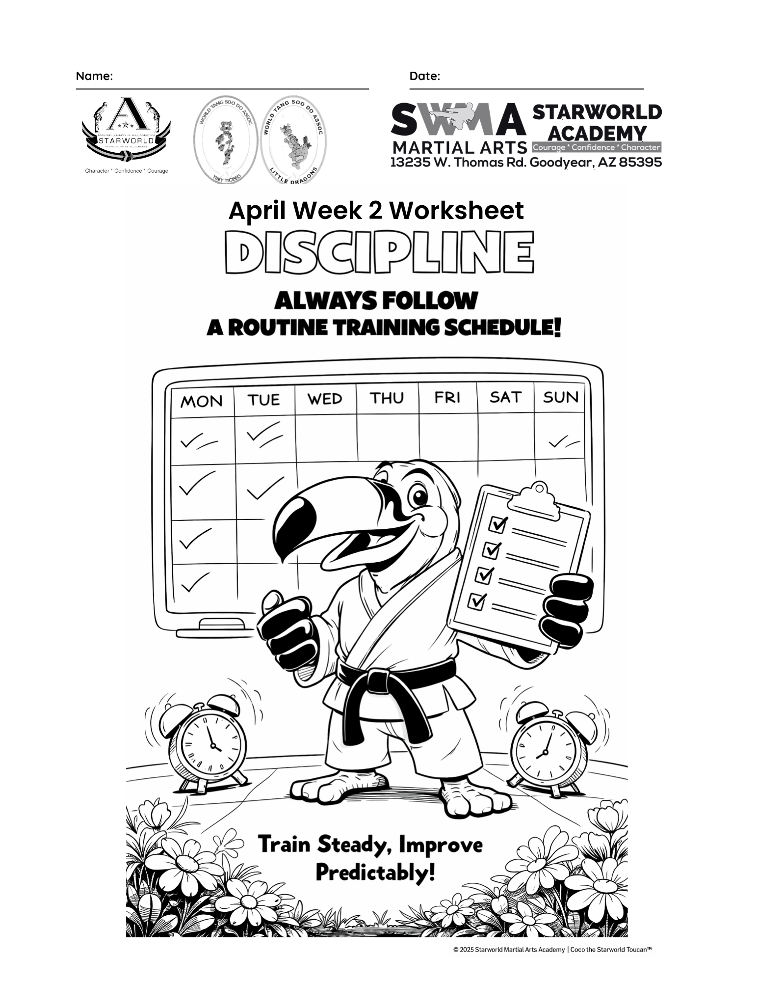 Discipline begins with structure. This week emphasizes the importance of having a plan and sticking to it. Students learn that progress is not random—it comes from training consistently on a set schedule. When training becomes part of a routine, improvement becomes predictable.
